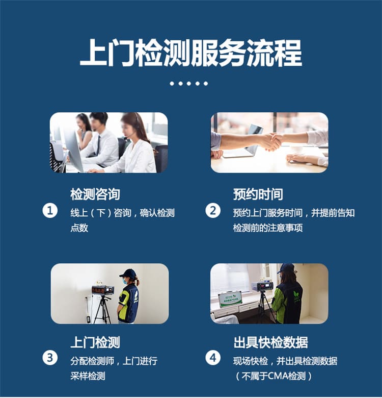 電話或網(wǎng)絡(luò)預(yù)約→獲取報(bào)價(jià)方案→按照檢測(cè)要求準(zhǔn)備→技術(shù)人員上門采樣→精密儀器分析→出具檢測(cè)報(bào)告(蓋有格瑞樂公章)