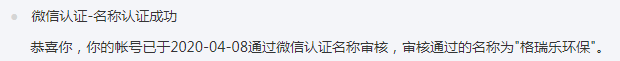 格瑞樂通過微信資質認證與名稱認證